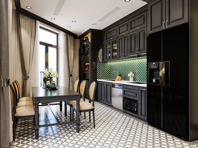 Indochine trong thiết kế phòng bếp mang đậm dấu ấn giao thoa giữa nét hoài cổ Á Đông và sự tinh tế của kiến trúc Pháp, tạo nên không gian vừa sang trọng vừa giàu tính nghệ thuật. Các chi tiết như họa tiết truyền thống, chất liệu gỗ tự nhiên và gam màu trầm ấm được kết hợp khéo léo để mang lại cảm giác ấm cúng và sâu lắng. Đây là lựa chọn lý tưởng cho những gia chủ yêu thích vẻ đẹp hoài niệm nhưng vẫn muốn giữ sự hiện đại.