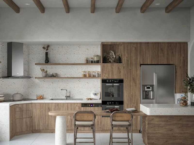 Không gian phòng bếp sử dụng gỗ tự nhiên mang đến vẻ đẹp ấm áp, bền vững và giàu giá trị thẩm mỹ theo thời gian. Các đường vân gỗ mộc mạc kết hợp cùng cách xử lý bề mặt tinh tế tạo nên cảm giác gần gũi nhưng vẫn sang trọng. Thiết kế thường chú trọng sự cân bằng giữa công năng và thẩm mỹ, giúp tối ưu trải nghiệm sử dụng trong sinh hoạt hằng ngày.