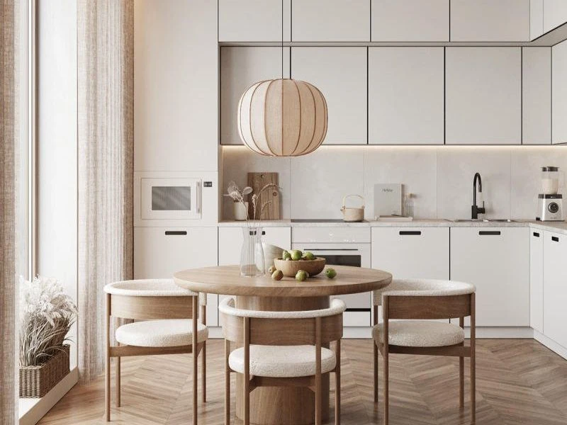 Mang tinh thần tối giản kết hợp sự ấm áp tự nhiên, không gian bếp theo phong cách Japandi đem lại cảm giác nhẹ nhàng nhưng vẫn đảm bảo đầy đủ công năng sử dụng. Thiết kế ưu tiên những đường nét gọn gàng, hạn chế chi tiết rườm rà để tạo sự thoáng đãng và dễ chịu trong sinh hoạt hằng ngày. Nhờ sự cân bằng giữa thẩm mỹ và công năng, khu vực bếp trở nên thư giãn, tinh tế và phù hợp với lối sống.