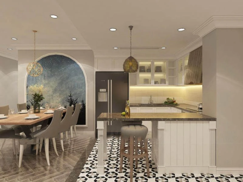 Phong cách tân cổ điển trong thiết kế mang đến vẻ đẹp sang trọng, tinh tế với sự kết hợp hài hòa giữa đường nét cổ điển và hơi thở hiện đại. Không gian thường được nhấn mạnh bằng các chi tiết phào chỉ mềm mại, hệ tủ bếp đối xứng và chất liệu cao cấp tạo nên cảm giác đẳng cấp cho tổng thể. Đây là lựa chọn phù hợp cho những gia chủ yêu thích sự tinh tế nhưng vẫn muốn giữ nét tiện nghi trong sinh hoạt hằng ngày.