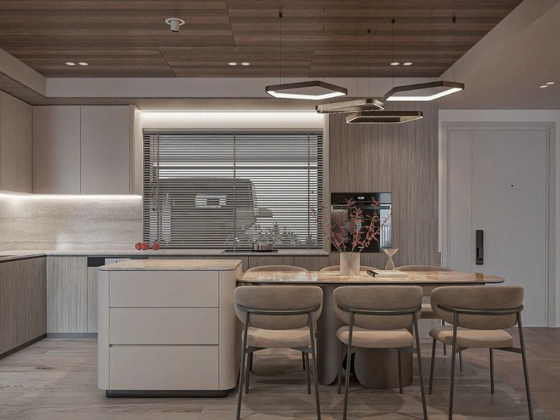 Không gian bếp kết hợp tủ bếp liền bàn ăn mang đến sự gọn gàng, tiện lợi và phù hợp với nhiều kiểu nhà ở hiện đại. Thiết kế thường hướng đến sự đơn giản với đường nét tinh gọn, hạn chế chi tiết rườm rà để giữ cho tổng thể luôn thoáng và dễ nhìn. Khi kết hợp cùng ánh sáng hợp lý và vật liệu hài hòa, không gian trở nên ấm cúng, dễ sử dụng.